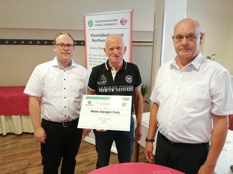 Aus der Laudatio auf die Preisträger ist über den Kreisehrenamtspreisträger Hans-Jürgen Matz (auszugsweise) zu sagen, dass er in seinem Umfeld als lebende Legende betitelt wird. Seine Laufbahn begann als Neunjähriger in der Schülermannschaft. Als 17-Jähriger bestritt er sein erstes Herrenspiel. 1986 beendete er seine aktive Karriere und wechselte auf die Trainerbank. Er gilt in seinem Verein auch fast als Fußballvater. Darüber hinaus engagiere er sich im SC Schoningen auf verschiedene Ebenen, selbst Corona konnte ihn nicht bremsen. Mit der Ehrung für Hans-Jürgen Matz ist auch die Aufnahme in den Club 100 des DFB verbunden.