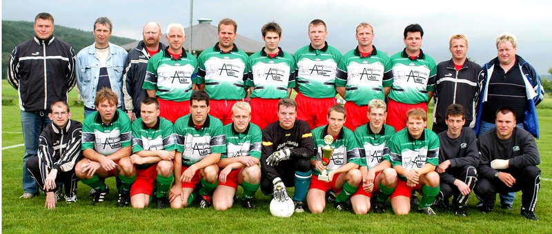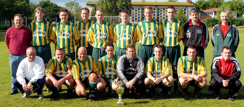 Fußballfachwart Carsten Möhrs, Mario Steinhoff, Betreuer Udo Anders, Mario Albrecht, Tobias Schulz, Stefan Ahlert, Andreas Möhrs, Carsten Möhlke, Peter Heese, Trainer Uwe Ellies, SG-Vorsitzender Klaus Falke