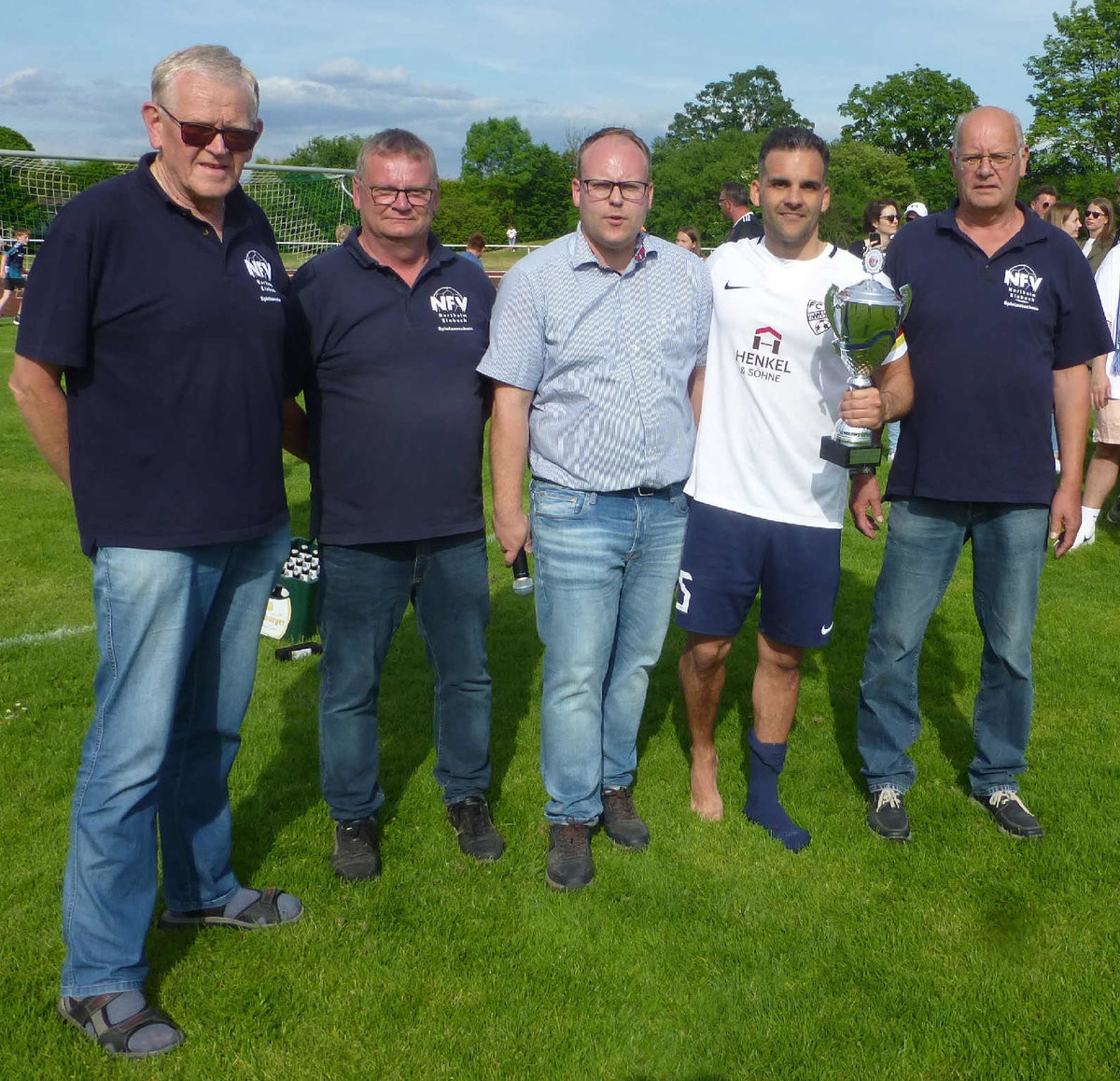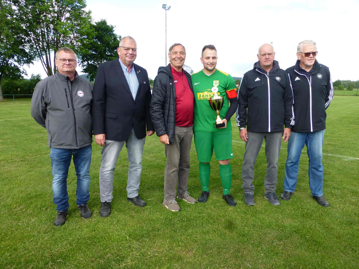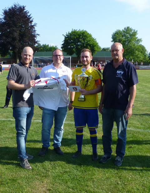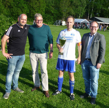 Rechts im Bild: Bei der Pokalübergabe mit dabei Heinz Schwingel (Vorsitzender des Spielausschusses), Jörg Henne (Spielausschuss), Henning Hartrje (Kreisvorsitzender) Mannschaftsführer Marcel Rittmeier und Uwe Achtermann (Pokalspielleiter).