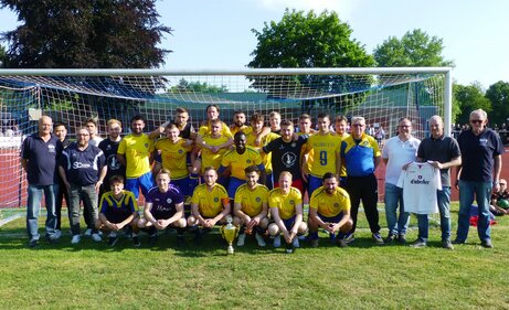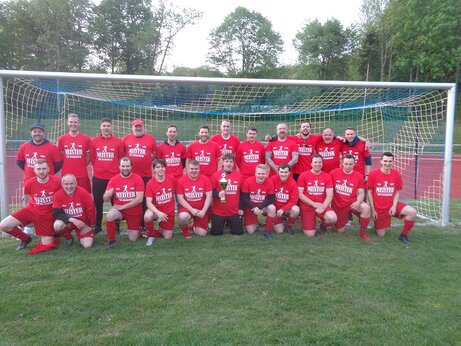 Bild rechts: Auch wenn der Schiedsrichter das Spiel um die Altherren-Kreismeisterschaft aufgrund einer Schiedsrichterbeleidigung von einem Zuschauer der Heimmannschaft abgebrochen hat , waren beide Mannschaft mit der Wertung dieses abgebrochenen Spieles durch die Spielinstanz zufrieden und dokumentierten dies mit einem gemeinsamen Foto.