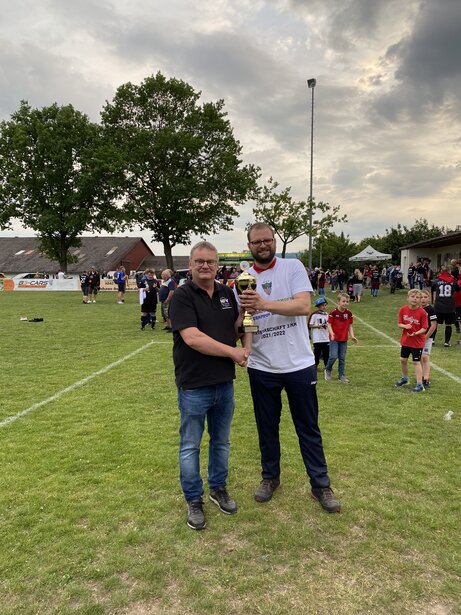 Staffelleiter Jörg Henne überreicht den Pokal an die Spieler David Böning und Ibrahim Yoksulabakan.